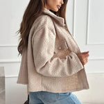 The plush teddy texture offers a soft, cosy embrace, while the tailored cropped cut ensures a flattering silhouette that pairs seamlessly with jeans, skirts, or tailored trousers. Gold-tone statement buttons elevate the design, giving it an editorial edge that makes you feel instantly put-together.