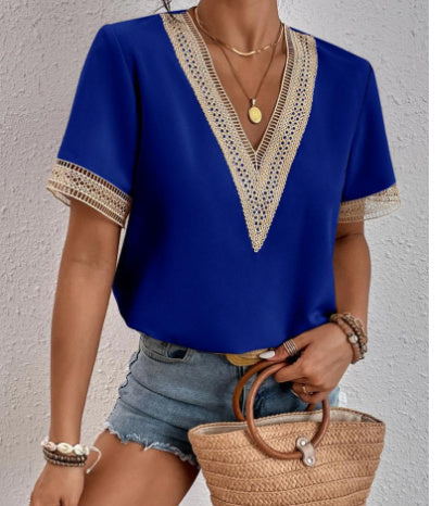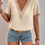 Elevate your wardrobe with our Luxe Embroidered V-Neck Blouse – where modern tailoring meets timeless elegance. Designed for the contemporary woman who values both comfort and sophistication, this short-sleeve blouse is crafted from a lightweight satin-blend fabric that feels silky smooth on the skin. The refined V-neckline is accented with delicate crochet embroidery that subtly highlights the décolletage, while the matching trim on the sleeves adds a cohesive and polished finish.